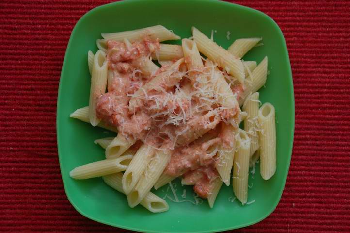 Heute gab es Penne mit Soße aus stückiger Tomate, Frischkäse und Knoblauch.