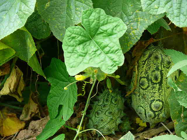 Ich will die Horngurken oder Kiwanos mal wieder aus der Versenkung holen. Habe dieses Jahr wieder 8 Pflanzen die prächtig gedeihen. Bis jetzt habe ich allerdings erst einzelne Blüten gesehen, hoffe jedoch dass es auch Früchte gibt. Die verstecken sich erfahrungsgemäß ziemlich gut, sodaß man sie erst findet wenn sie schon etwas größer sind. In der Mitte steht unser Christbaum, an dem sollten sie hochklettern, er ist aber zu klein