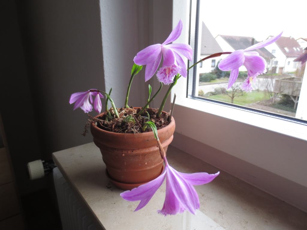 Gekauft als 'Ballerina', aber weil die Blütezeit sich als sehr kurz erwiesen hat und weil die Blüte unsymmetrisch ist, habe ich Zweifel, ob das richtig ist.Re:Pleionen - drinnen und draußen