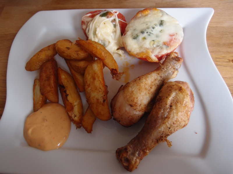 gestern kleine hähnchenkeulen mit kartoffelecken und tomaten mit weg-muss-mozzarella. alles aus dem ofen.
