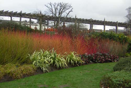 Ja, die Winterpflanzung ist ja enorm im Kommen. Und was man nicht so alles pflanzen kann: Gräser, Hartriegel, Bergenien, Heidekräuter, Zaubernuss, Lonicera, Lenzrosen, frühe Zwiebelpflanzen, Schlangehautahorn, andere interessante Baumrinden, natürlich der ubiquitäre Duftschneeball und noch viel mehr. Hier ein Bild.