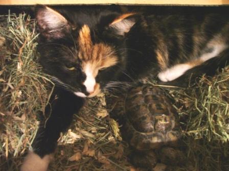 Das Foto ist leider etwas dunkel. Aber man sieht unten rechts, daß die Schildkröte Kopf und Beine nicht eingezogen hat. Die beiden teilen sich im Sommer im Garten auch das Schildkrötengehege. Sandig und in der Sonne. Mal steht die Katze auf und läßt die Schildkröte vorbei, mal läuft die Schildkröte um die Katze herum.