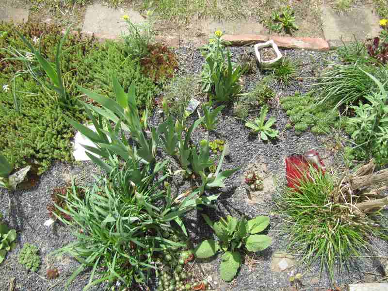 man verzeihe mir den undekorativen Topf, in dem ich versuche, ein paar Fritillarien groß zu ziehen. Interessanter ist der kleine versenkte Topf mit der Lewisia rediviva, die bald blühen wird. Wenn die Blüte vorbei ist und das Laub abgewelkt, kommt das Töpfchen raus und übersommert in einer Abseite.
