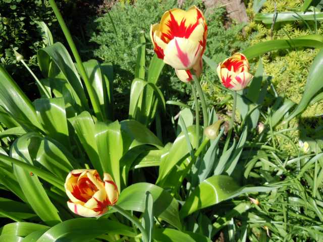 Rhododendron, Gartenheidelbeere und Hosta sind Flachwurzler. Die entziehen dem Boden doch reichlich Feuchtigkeit.Und an genau so einer feuchten Stelle zwischen Rhododendron, Magnolie, Gartenheidelbeere, Hosta.....wächst die Tulpe "Ronaldo".Meine Beobachtung ist, das Stellen die im Sommer gut trocken sind von Tulpen allgemein gut angenommen werden. Habe auch ein paar späte einfache Tulpen die immer wieder kommen. Gar nicht mögen Tulpen Stellen die im Sommer feucht gehalten werden, weil dort Stauden oder Gehölze stehen, die gegossen werden müssen.Die dürfte dort eigentlich gar nicht wachsen!Da hätt ich die nie hingesetzt, aber ich hatte keinen Platz mehr und die Tüte mit den Tulpenzwiebeln lag noch im November rum. Da hab ich sie halt dort eingegraben.Schön, dass dieses Thema auch noch andere interessiert