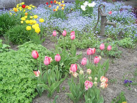 Und ein Blick auf das Frühlingsbeet, das bei mir ruhig schön bunt sein darf: