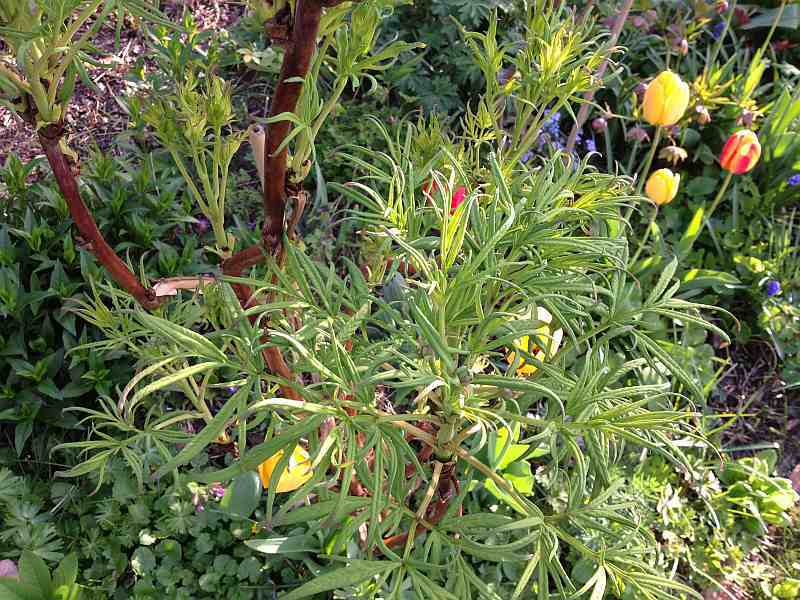 eine (wie ich seit ein paar jahren weiß, orangerotblühende) paonia delavayi, die ich vor noch mehr jahren mal von henriette bekam, ist endlich mal nicht bis zum boden zurückgefroren!