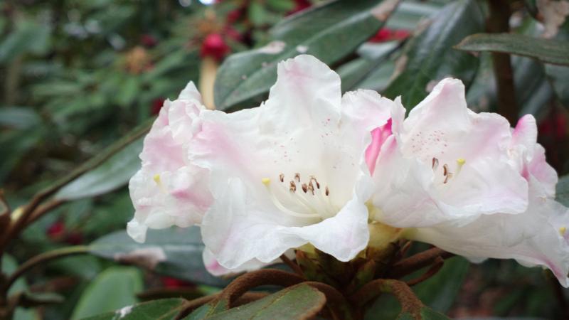 Die vielen Bilder der höchst eindrucksvollen Sammlung botanischer Arten von StephanHH zeigen deutlich, dass die in der Natur vorherrschenden Rhododendron-Farben Weiß und Rosa sind. Bei den im Baumarkt- und Pflanzencenter-Handel befindlichen Hybridsorten gibt es einige wenige rosa Sorten, aber beim Weiß findet man meist nur 'Cunningham's White'. Dabei ist die Farbe Weiß zum Aufhellen des Hintergrunds oder zum Trennen anderer Farben eigentlich unentbehrlich, und weiße Blüten mit Zeichnung sind sehr schön.
