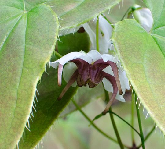 Ein gutes Bild. Die Blute von Epimedium 'Epsteinii' zusammen mit seinem gezahnten Berberis-Blatt.