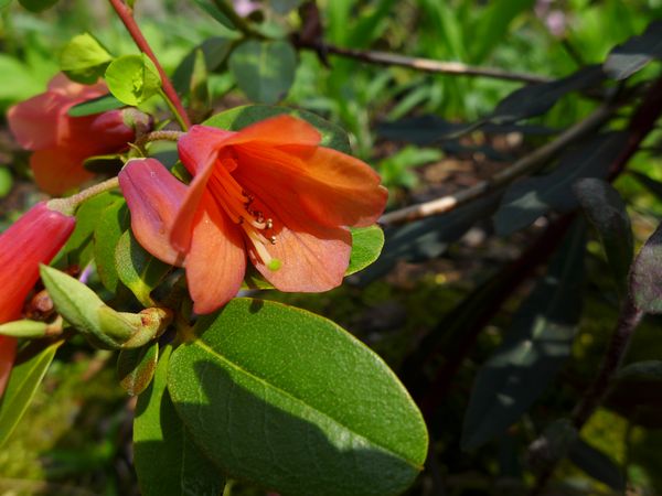 R. cinnabarinum (concatenans ist wohl auch nicht mehr zulässig; es ist ein Kreuz mit der R.-Taxonomie) blüht dieses Jahr nur sehr schwach, da er in zwei Wintern zusammengestaucht worden ist.