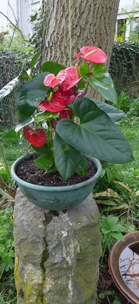 Ich versuche es mal.Anthurium unter dem Nussbaum. Wenn alles belaubter ist, dürfte es ein wenig natürlicher wirken.