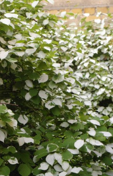Ähnlich schattig in der Schlippe zwischen zwei Häusern steht hier Actinidia kolomikta. Wenn sie darf schafft die problemlos 4 Meter. Kann aber auch einfach in Zaum gehalten werden.