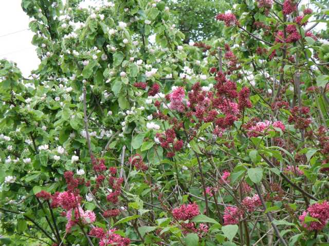 Syringa x prestoniae "Miss Canada" vor Cydonia "Konstantinopler"