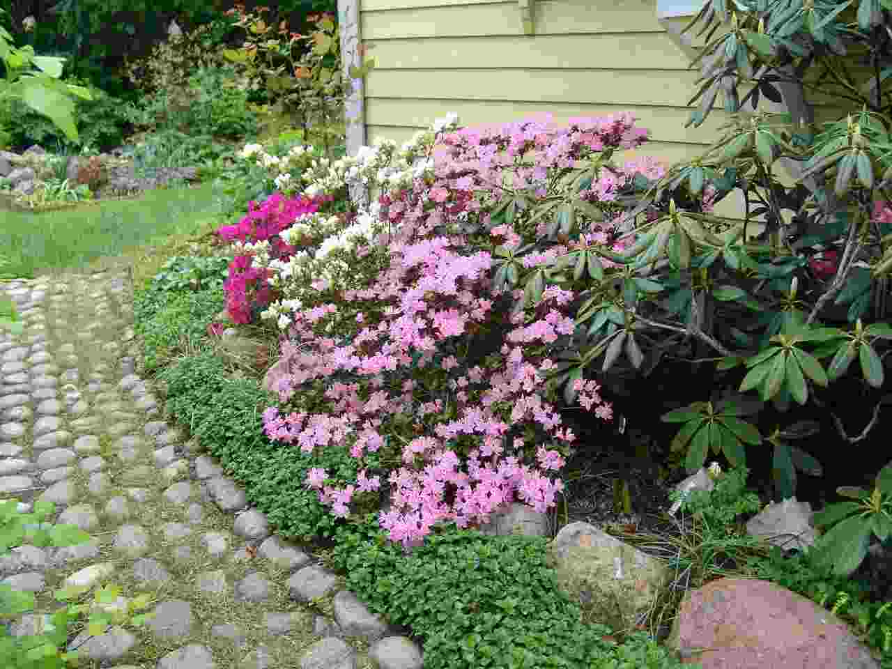 So ein schönes Pflaster aus Rundkieseln und so schön blühende Rhododendren und so ein großer Bestand Trillium ist doch echt sehenswert!