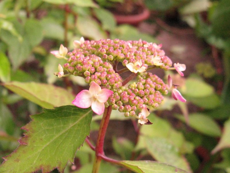 Die im Keller überwinterten Hortensien beginnen langsam Farbe zu zeigen.Vermutlich heißt diese kleine Schöne 'Ai Hime'. Auf jeder Spitze sitzt so ein kleiner Blütenschirm.
