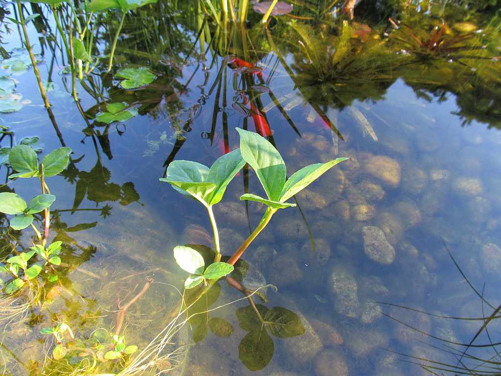 Aber es funktioniert ohne mein Zutun. Der Pegel beträgt nur ca. 25 cm. Es befinden sich einige Goldfische darin, die ich auch füttere. Die Krebsschere, Stratiotes aloides, gedeiht auch gut und blüht.