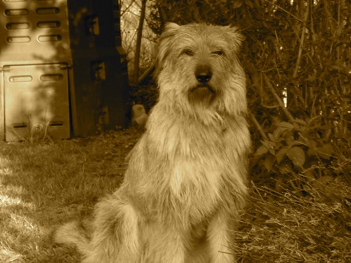 ) sei Dank, dass ich euch Hundenarren - in deren Kreis ich mich urig wohl fühle! - meine drei Gartenwächter/Beetzertrampler/Hilfsarbeiter/Buchsanpinkler/Erdbeerendiebe vorstellen darf.Den ersten im Bunde hab ich vor fünf Jahren im Tierheim abgeholt: Ein Irish Wolfhound-Riesenschnauzer Mischling mit "leichter" Tendenz zu übermässiger Hyperaktivität, die sich aber inzwischen immer mehr und mehr legt (Gott sei Lob und Dank!!).Sein Name ist Yorrick und wie der aus Shakespeare's Hamlet ist er der geborene Hofnarr. Leute zum Lachen zu bringen ist sein Lieblingshobby, darum haben wir mit dem Begleithundetraining (in der Schweiz viel "militärischer" als in Deutschland) aufgehört und üben stattdessen publikumswirksame Tricks.Eigentlich hält er sich für eine Katze, was sich bei seinen Ausmassen durchaus nachteilig auswirken kann, z.B. wenn er wieder mal voll Selbstverständlichkeit auf den Schoss klettert und einem die Sicht zum Fernseher versperrt (das ist nicht der Nachteil ... eher, dass man danach wie eine zerdrückte Fliege aufm Sofa zurückbleibt