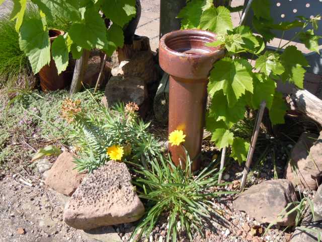 Gazania linearis hat erstmalig gut überwintert und strahlt schon den Sonnenschein aus :DDaneben Euphorbia rigida und die "Gießhilfe" für die Weinstöcke "New York Muscat" und "Suffolk Red"