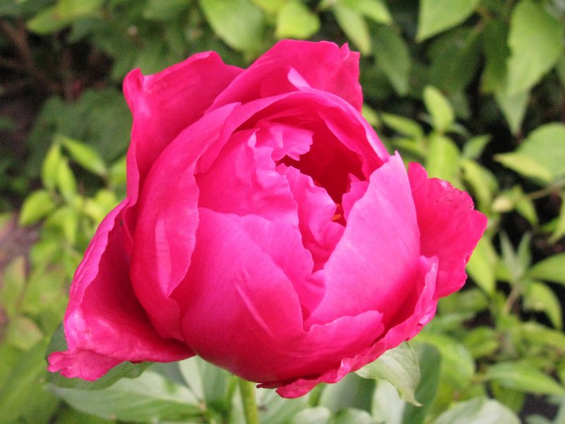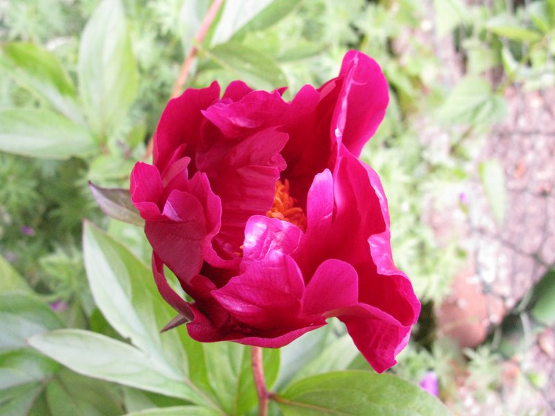 Dann will ich mal unsere Pfingstrose vorstellen. Namenlos, da vererbt und vermutlich 50 Jahre oder älter. Halt eine der üblichen alten Pfingstrosen die man am einen Tag ins Zimmer reinträgt, am selben Tag hunderte von Ameisen rauswirft die aus der Blüte rauskrabblen und dann am nächsten spätestens übernächsten die ganze Blüme zerfällt und dann auch rausgeworfen wird. Bei Regen ist eh immer schnell alles zerfleddert.Hier die Blüte: