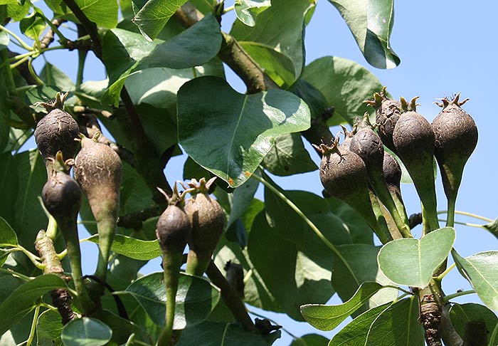 Conference ist zu 100% betroffen, die vier anderen Sorten teilweise bis gar nicht. Am wenigsten die "Frühe von Trevoux". "Stuttgarter Gaisshirtle" hab ich mir noch nicht angesehen.Die Birnen werden auch nichts mehr, die Risse und Narben in diesem frühen Stadium machen das Fruchtfleisch steinzellig und holzig. Mal sehen, was der Baum in den nächsten Wochen von selbst abwirft, ich werde den Rest nochmal kräftig reduzieren damit der Blütenansatz nächstes Jahr gut ist, wie Apfelfreund bereits vorgeschlagen hat.