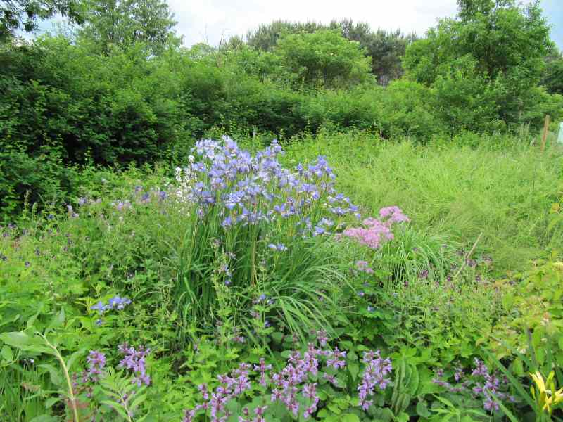 Auf diesem Foto beispielsweise sieht man einen Teil des Beetes, den ich im vor vier bzw. drei Jahren den Schneebeeren abgetrotzt habe. Das hellgrüne diffuse Gewirr hinter den hohen Iris sibirica besteht aus niedergeschnittenen wieder hochwachsenen Schneebeeren, in denen jetzt - weil mehr Licht rankommt - jede Menge klebriges Labkraut mit Brennnesseln und Quecke hochkommt. Halleluja!Die hohe dunkle Wand darüber sind alles auch Schneebeeren. Wenn ich die wegbeamen könnte, würde ich dort wunderbare Gehölze pflanzen können. So langsam gewöhne ich mich an den Gedanken, dass ich das möglicherweise nicht mehr in diesem Leben schaffe. Aber es ist ja auch sonst noch etwas Platz.