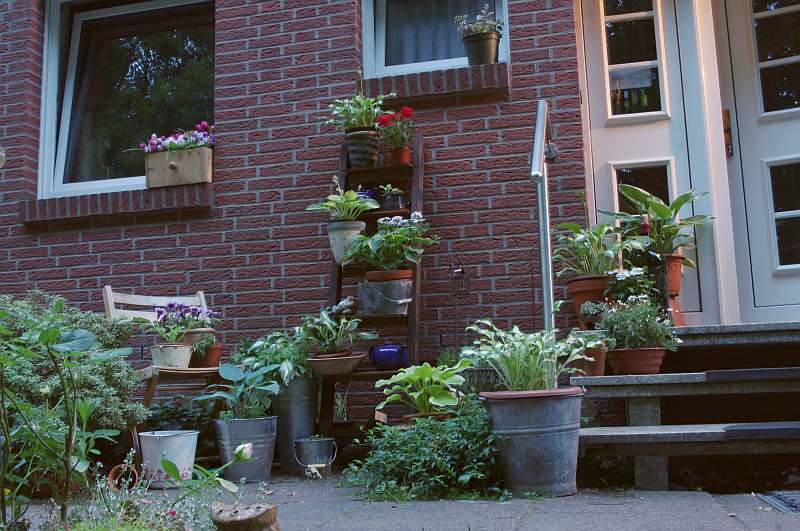 Schließlich habe ich nicht nur Topfhosta, sondern auch eine ganze Menge in den Beeten ausgepflanzt. Die Untersetzer habe und nehme ich nur für die Pflanzen in frostfester Keramik auf der Dachterrasse bzw. den Balkonen. Der Rest steht in schwarzen Plastikpötten ohne weiteres überall auf dem Grundstück verteilt, wird aber je nach Laune immer mal wieder umgruppiert. Da kann es also nicht wirklich zu einem Erdanschluss kommen, was aber auch nicht gewollt ist.