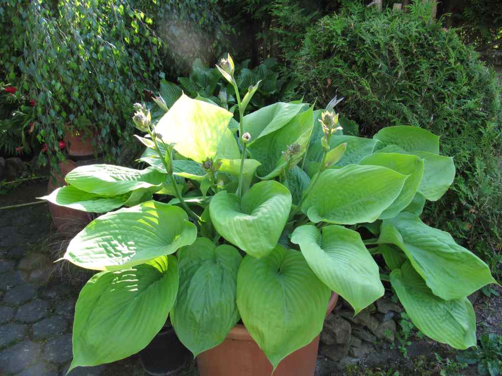 Ich bin auch sensibilisiert. Daher bin ich vorhin nochmal mit der Digi rumgegangen um die Hostas zu fotografieren. Alle Töpfe lassen sich nicht in Sicherheit bringen. Aber ich werde gleich noch einige vorsichtshalber unters Dach stellen. Die S&S habe ich gerade auch fotografiert. Sie steht schon seit vielen Jahren in diesem Topf. Darin wird sie auch wohl bleiben, bis.... Sie bekommt im Frühjahr Blaukorn um die Triebe und das klappt bisher.
