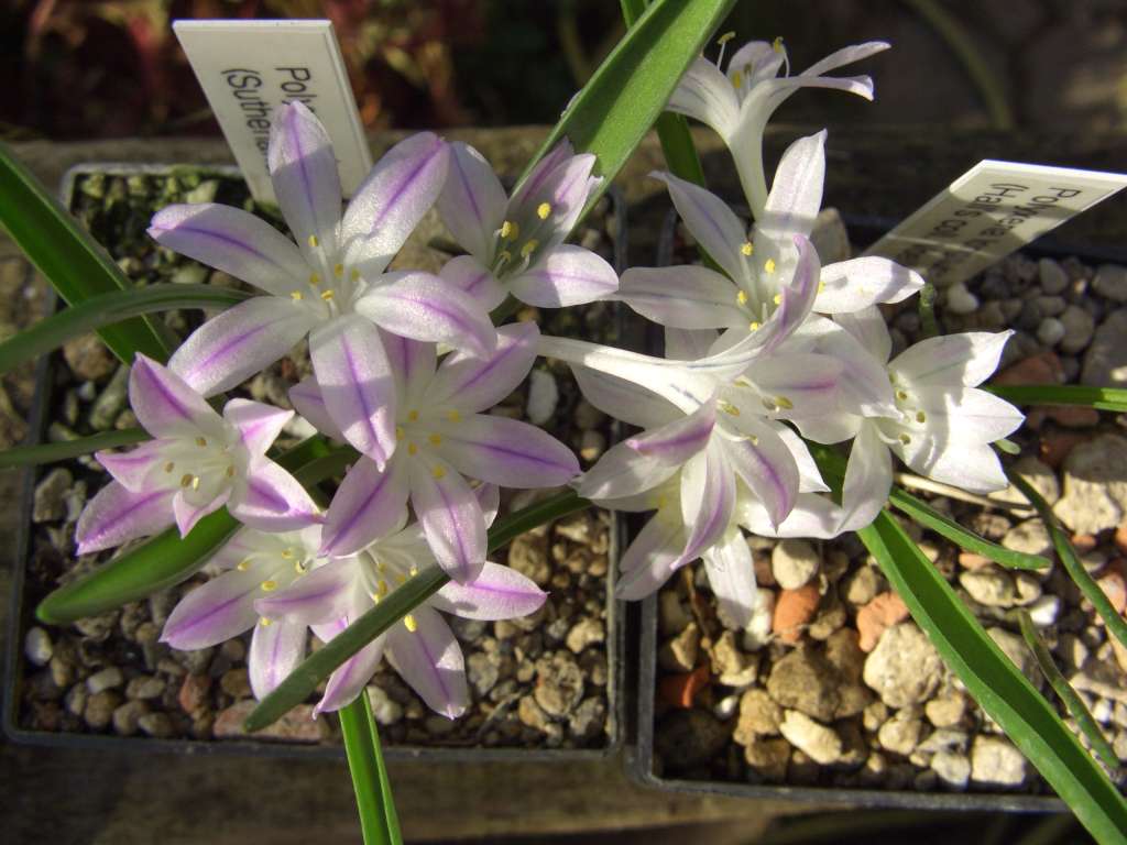 Immer wenn im Herbst die schönen Polyxena-Arten in Blüte gehen, wundere ich mich, warum diese unter Glas völlig problemlosen Pflänzchen nicht mehr Verbreitung finden. Wer weiß, vielleicht sind sie mit ein wenig Nässeschutz bei uns sogar winterhart? ::)Den Reigen dieser wie kleine Scilla aussehenden südafrikanischen Zwiebelgewächse beginnt wie immer Polyxena longituba. Hier mal zwei Varietäten aus unerschiedlichen Aufsammlungen.