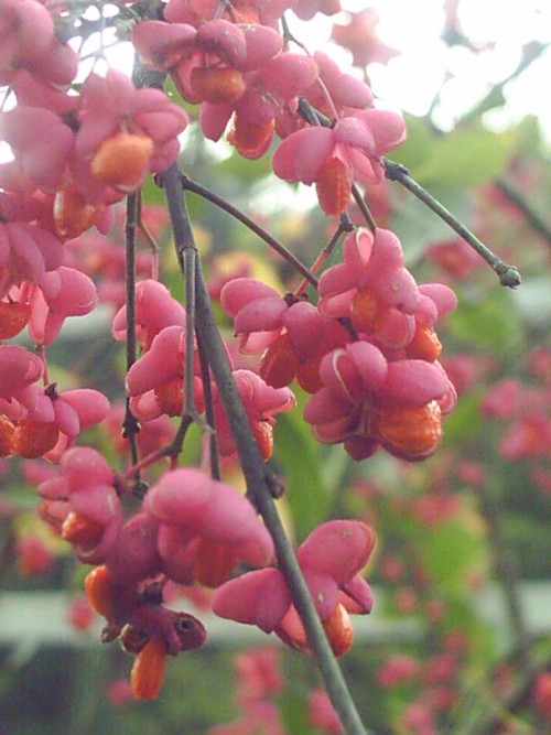 die leuchtend rote pflanze wird ein euonymus alatus (geflügelter spindelstrauch) sein.mir fallen gach ein: euonymus europaeus, das klassische pfarrerkapperl.euonymus verrucosus, auch aus europa, für trockenere standorteeuonymus planipes, kenne ich mit ätherisch gelber herbstfärbungeuonymus turkestanus, niedriger bodendeckereuonymus alatus eben, davon gibts eine niedrige form.euonymus japonicus, immergrüne, recht grosse blätter.euonymus fortunei, mit kletternden abarten (e.f. var. radicans), immergrün.da gibts sicher noch mehr, aber die werden hauptsächlich gärtnerisch genutzt...lg, brigitte