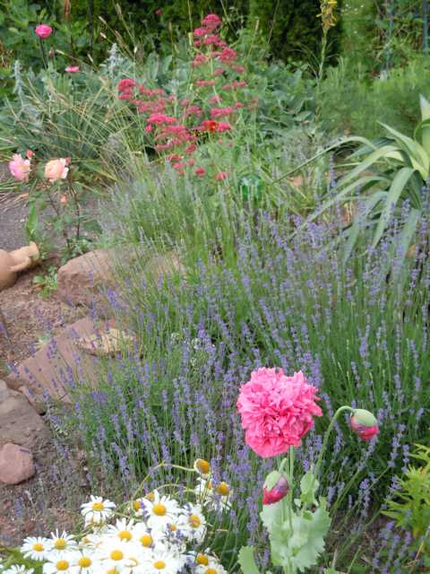 jo, leider hab ich nicht diese sonnige weite, die deine herrlichen Pflanzungen zu bieten haben. bei mir sind das wenige kleine beetchen in der sonne, der restliche garten ist schattiger.hier mal mein feigenbeet im vorgarten an der südwestseite des Carport.die säckelblume "gloire de Versailles" hat ihre duftigen büten geöffnet.