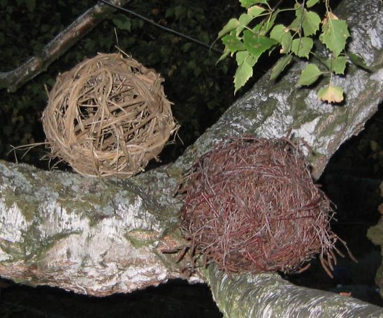 Im Vordergrund eine bereits etwas abgeplattete Kugel aus Birkenreisig, im Frühjahr hergestellt, im Hintergrund eine Kugel aus Clematisreben, vorgestern gemacht.
