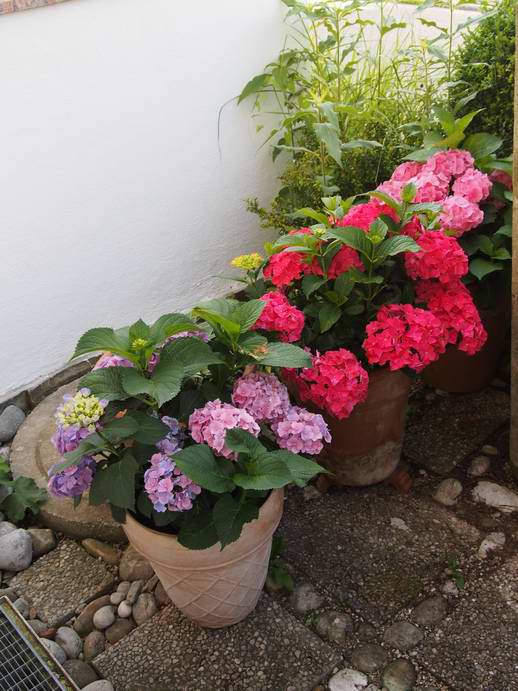Meine neu gekauften Forever&Ever Hortensien im Topf (Vorgarten bzw. wo zwischen den Tonnenhäuschen noch Platz ist...)