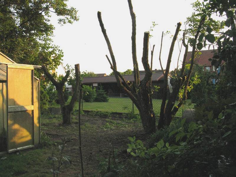 Nun lacht nicht... ich bin ja selber Schuld. :PAm letzten Mittwoch rief der Forstwirt meines Vertrauens an, er hätte am Freitag Zeit eine marode Eierpflaume (links auf dem Foto, der Stamm wird noch ausgebuddelt) in meiner Schmuddelecke herunter zu sägen, deren Äste weit über mein Gewächshaus ragten.So weit so gut. Als wir fleißig am sägen waren, fiel uns auf, dass wir damit eine Windschneise schaffen, die dem daneben stehenden uralten Sambucus nigra (rechts im Bild) bei einem Sturm gar nicht gut bekommen könnte. Also auch hier wenigstens die Köpfe weg. Vielleicht treibt er ja sogar dort wieder aus, wo wir es von ihm erhoffen.Nun habe ich durch diese Aktion nicht nur die Licht- und Windverhältnisse in diesen Gartenteil völlig verändert sondern auch eine Fläche von ca. 9 x 5 Metern, die ich möglichst rasch wieder halbwegs dicht bekommen aber auch ansprechend und nachhaltig und ohne viel Pflegeaufwand eher "waldartig". bepflanzen möchte.Ich habe bisher folgende Ideen im Kopf:Dort, wo der Stamm der Eierpflaume steht, einen Hochstamm pflanzen. Aber was?Am Zaun drei bis vier Großsträucher pflanzen, die relativ rasch wachsen und wenigsten den Wind aus Westen möglichst schnell wieder brechen und ein wenig Schatten schaffen.Die ganze Fläche mit einem einzigen Bodendecker bepflanzen. Ich dachte hier an Lamiastrum galeobdolon 'Florentinum', den ich selbst in ausreichenden Stückzahlen zur Verfügung habe.Dazu (natürlich