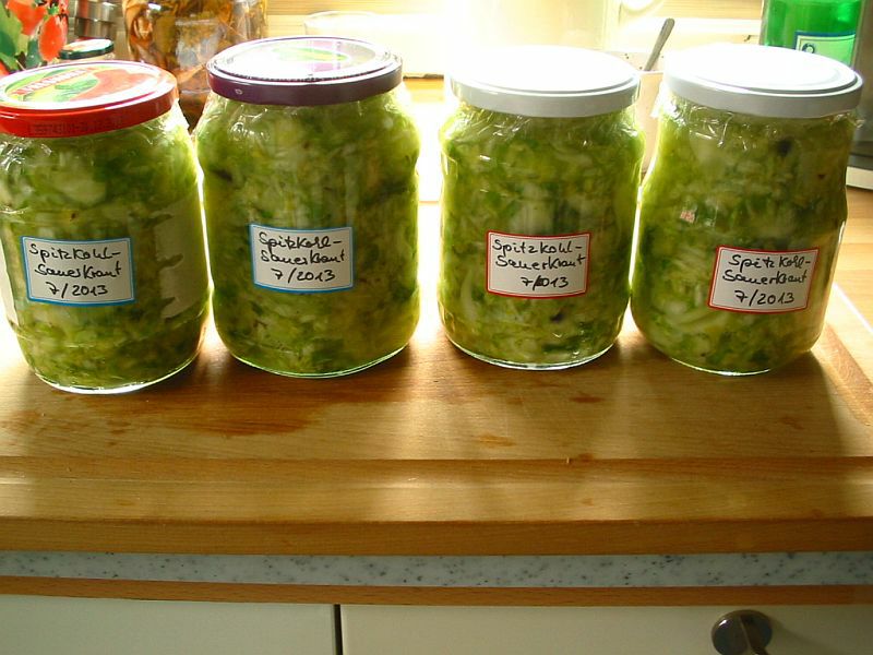 Da ich immer noch unter Spitzkohlschwemme leide und nicht alles einfrieren will, hab ich nochmal was Milchsaueres probiert. Nach dieser Anleitung hab ich es mit meinem Spitzkohl versucht, gewürzt mit Kümmel, Pfefferkörnern, Nelken und Wacholderbeeren.Ich bin ja selbst noch skeptisch, ob die Gläser beim Gären nicht platzen, aber offenbar scheint das tatsächlich zu funktionieren, nur eine Wanne für austretende Gärflüssigkeit muss man wohl unterstellen und sicher die Gläser dann auch mal zwischendurch abwaschen, na denn. Wenn das geht, wär mir das für unseren kleinen Haushalt lieber, solche Portionsgläser zu haben, statt einen großen Gärtopf ansetzen zu müssen.