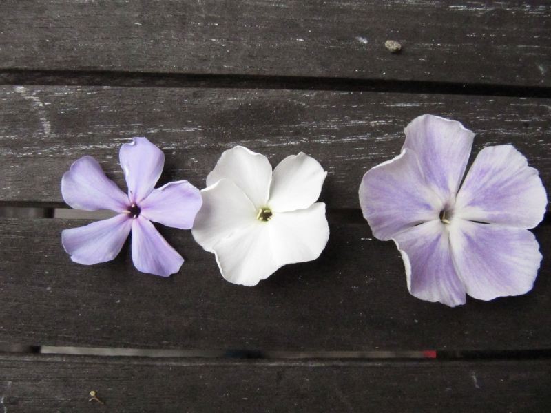Hier drei Blüten im Vergleich. Von links nach rechts:Blue Evening, reinweißer Wucherphlox, Lieblingsphlox.