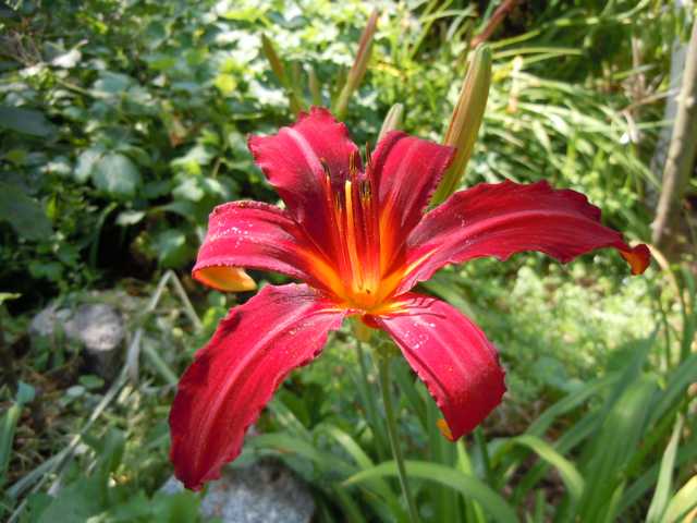 So, nun hab ich doch mal wieder Hemerocallis fotografiert. Ich versuche mal, sie im Kontext zum restlichen Garten zu zeigen. Es sind alles Hemerocallis, die aus meiner einstigen Sammelwut übriggeblieben sind, und die nicht gepflegt, gewässert und großartig gedüngt werden. "Zart" sind sie nicht alle, "Arten" auch nicht. Mit den Neuzüchtungen im Hemerocallisthread können sie nicht mithalten, deshalb hier.Vermehrt wird durch "Durchstechen mit dem Spaten", so erst dieses Frühjahr passiert.Die meisten stehen irgendwo am Rande einer Hecke und lichtschattig unter Obstbäumen.Momentan ist es sehr trocken und hat seit 4 Wochen nicht geregnet.