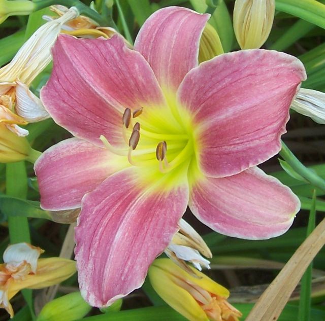 Eigentlich wollte ich dieses Jahr gar keine Bilder zeigen weil meine Taglilien dieses Jahr so schlecht aussehen wie nie zuvor.Viele von Euch reden von einem tollen Taglilienjahr, ich kann das leider nicht bestätigen. Hier ist es seit Wochen trocken, die ganze Tagliliensaison, das heißt ich habe eingetrocknete Blütenstengel, Blütenblätter die durch Hitze und Trockenheit verkleben und nicht öffnen, ganz zu schweigen davon, daß viele Blüten ab 12 Uhr bäh aussehen :(Ganz ehrlich, ich habe tagelang die Blüten nicht mal angeschaut weil mich das Elend ärgert.Ich zweige nun aber doch einzelne Sämlinge, die mich dieses Jahr begeistern und das ohne Wasser.Das da ist zwar in der Farbe nix besonderes aber die Blüten sehen immer schön aus, die Pflanze ist blühfreudig, kaum ein Tag ohne Blüten und die rosa Farbe wirkt wie mit einem Schwamm gewischt.
