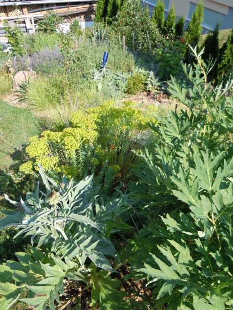 Clematis "Kaiu" ist extrem dürrefest und hangelt sich durch Stachys "Big Ears", Artemisia abrotanum und Origanum ?