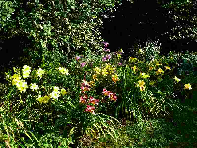 On einem Taglilienbgarten überwiegen naturgemäß die Taglilien. Aber auch sie sind alle Gartensorten.hier am Gehölzrand knochentrocken.Leider bringen 80kb-Bildchen nicht viel.