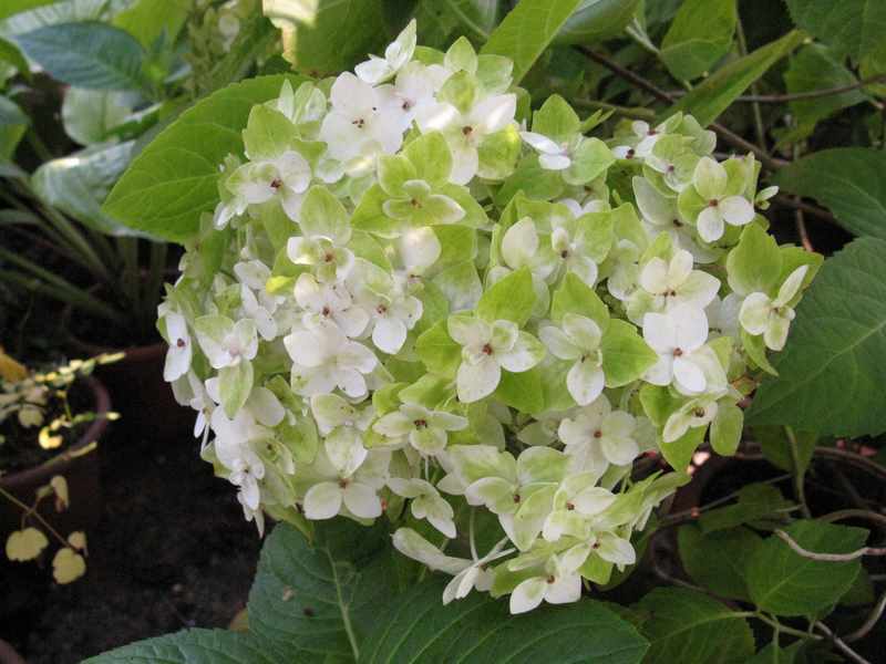 Hydrangea involucrata 'Yokudanka' in diesem Jahr mit reinweißer Blüte.