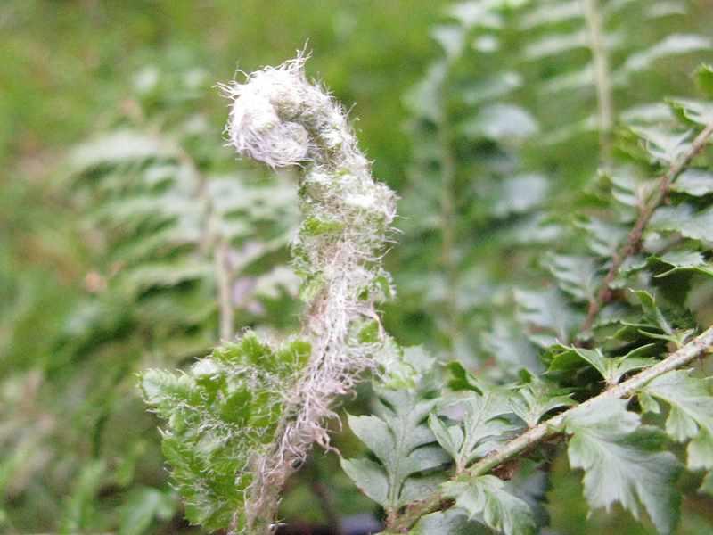 Und ein frischer Austrieb, der sehr speziell ist.Ich halte die Pflanze für einen Schildfarn. P. aculeatum oder P. setiferum scheint es nicht zu sein. Bleibt P. polyblepharum, den ich einige Jahre im Gewächshaus überwintert habe, wo er seine Sporen ausgestreut haben könnte.Ich kann mich aber auch irren und es ist ganz etwas anderes.