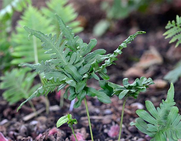 Dafür ist dieser Winterhart. Polypodium interjectum 'Glomeratum Mullins'. Ein komischer Typ. Jedes Blatt sieht anders aus.