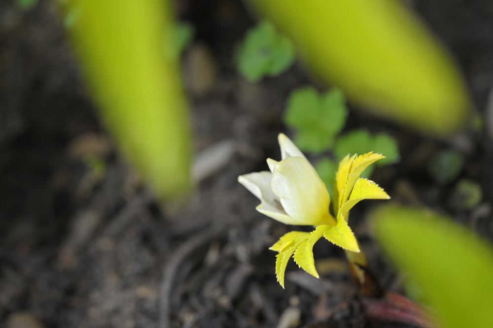 Da der Boden noch gefroren war, habe ich sie zunächst in 10-Liter-Eimer gesetzt, wo sie auch jetzt noch darauf warten, endlich ausgepflanzt zu werden. Gestern beim Gießrundgang, fiel mir eine Blüte auf. Und an der Basis stehen noch zwei Blütentriebe in den Startlöchern. Was ist denn bloß mit der los