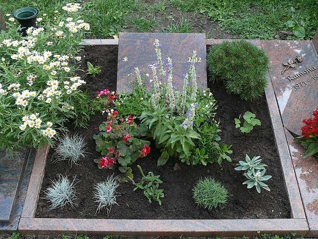 Ich schließe mich hier auch nochmal an, da am Grab meiner Eltern unbedingt etwas geändert werden muss. Ein Problem ist, dass ich zu weit weg wohne, und höchstens einmal im Jahr danach schauen kann. Und was die pflegende Gärtnerei macht, gefällt mir nicht so ganz.Ursprünglich gab es eine Buchshecke als Begrenzung, die aber angeblich krank war. Ganz sicher, dass das stimmt, bin ich nicht, denn im oberen Bereich ist immer wieder ein Maulwurf oder eine Wühlmaus tätig, so dass die Randpflanzen hochgehoben werden und möglicherweise handelte es sich auch um Trockenschäden. Jedenfalls hatte ich aus der Ferne zugestimmt, den Buchs durch Euonymus zu ersetzen, und das gefällt mir eigentlich auch ganz gut.Was mir nicht gefällt ist die Tatsache, dass alles immer noch sehr hoch sitzt. (Wie lange senkt sich so eine Grab? Sarg + Urne) Am vorderen Rand hängen die Wurzeln im Prinzip in der Luft. Und das grabende Tier ist auch noch vorhanden, zumindest waren hinten wieder Pflanzen lose, und insgesamt sind die hinteren Euonymus auch viel mickriger. Außerdem ist die Waldsteinie vom Nachbargrab ziemlich aufdringlich.Deshalb werden wir als äußere Begrenzung wohl eine Steinkante setzen lassen, und hoffentlich passt dann der Euonymus noch.Hinten sitzt eine Bernsteinrose, und die wird regelmäßig von der Gärnterei umpflanzt. Mit Hornveilchen sieht das ganz nett aus, die Begonien gefallen mir weniger (vor allem keine Mischung rot und rosa), Erika im Winter finde ich auch nicht so toll. Außerdem sitzen die Pflanzen meiner Meinung nach zu dicht an der Rose, was in Bezug auf Pilzerkrankungen sicher nicht so günstig ist.Womit könnte man die Rose dauerhaft umgeben, so dass eine Wechselbepflanzung vielleicht sogar ganz wegfallen kann?Vor der Rose sitzen Blumenzwiebeln und eine Glockenblume. Das wollen wir durch ein Dreieck (Spitze oben) aus 3 Heuchera Osidian ersetzen, und unten hatte ich eine Salvia Caradonna geplant. Mein Exemplar im Garten ist allerdings inzwischen riesig und fällt auseinander, so dass ich mir nicht sicher in, ob die Idee so gut ist. Habt ihr vielleicht einen besseren Vorschlag?Freue mich auf eure Vorschläge