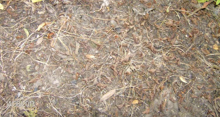 Weil im Büro gerade wenig los ist, mal ein paar Bilder der ganz anderen Art (empfindliche Gemüter bitte wegklicken)....Bei uns hat es seit Anfang Juli nicht mehr nennenswert geregnet und uns so eine Dürre von nie gekanntem Ausmaß beschert. Die Zisterne ist seit Mitte Juli leer, und seither können nur die Kernbereiche des Garten mit Leitungswasser am Leben erhalten werden (täglich 1-2 Stunden; jedes Beet bekommt alle 2-3 Tage was ab). Der Garten ist jedoch zu groß, um alles zu gießen. Nachfolgend ein paar Eindrücke aus den nicht bewässerten Teilen.Hier das Frühlings-Gedenkemein (Omphalodes); als Bodendecker unter einer hohen Eiche. Eigentlich sehr trockenresistent, aber wie Sie sehen, sehen Sie nichts (mehr).