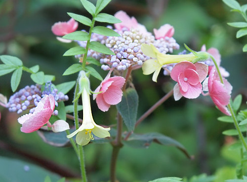 Die Hortensie hat zwei Jahre ungeschützt im Garten verbracht. Die gelbe Blume ist Polemonium pauciflorum.Sehr apart, Elfriede. Hat sie den Winter schon im Beet verbracht? Darf ich mal kurz nach dem Namen der zarten gelben Blüte fragen? Ich komm nicht drauf, obwohl ich sie schon einmal irgendwo bewundert habe.Hydrangea aspera 'Hot Chocolate' zeigt mir in diesem Jahr die ersten Blüten.