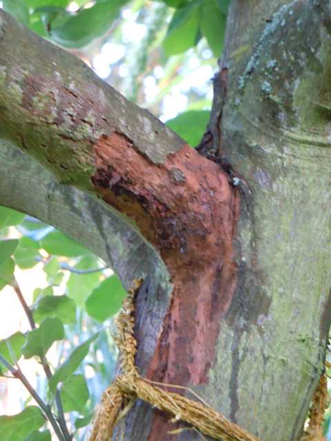 Im Frühjahr bemerkte ich am Stamm, dass die Rinde teilweise geplatzt war. Ich kenne das aber von alten Quittenbäumen und machte mir keine Sorgen.Als ich jetzt genauer hinsah, war es nicht mehr so toll. Ich machte die lose Rinde ab, darunter ist rotbrauner Bast, scheinbar (so hoffe ich) wird da neue Rinde gebildet. Oder?