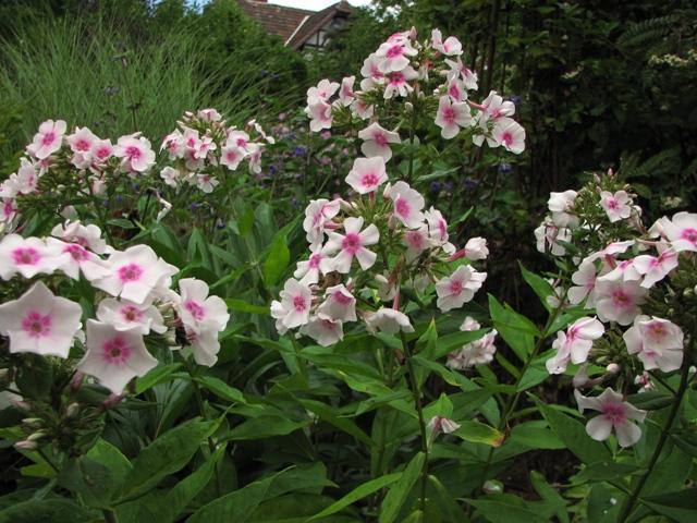 :DDie Farbe und die kleinere Blüte sind auch einer der (gestalterischen) Gründe für die Wahl dieses Phlox. Außerdem gelten Phlox amplifolia etwas trockenheitsverträglicher und weniger mehltauanfällig als viele Paniculata-Sorten, was sich hier bestätigt.
