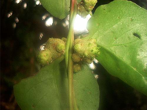 Bis du sicher, daß diese Knubbel normaler Bestandteil der Pflanze sind? Sieht für mich eher aus wie Gallen...Zeig' doch bitte noch mal ein ganzes Blatt von vorne.