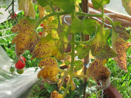 Was fällt Euch zu diesen Tomatenblättern ein?Folientunnel, Pflanzen in Töpfen.mfg pastinak