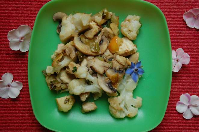 Hier gab es heute Pilzpfanne mit Äpfeln, Champignons, Riesenbovist, Blumenkohl und Frühlingszwiebel.
